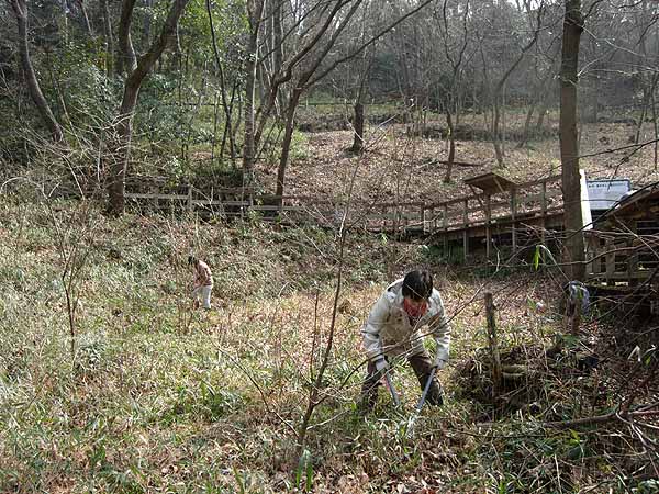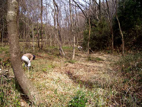 また、林床に落枝が散乱し、倒木も放置されていましたので、これらを片づけ、シャガを抜き取り、林内の伸びたササを刈り、ハンノキに絡みついたキヅタを伐り、