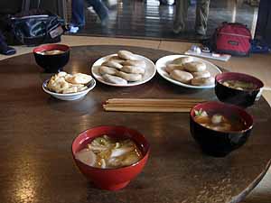 「里山民家《の母屋でお話を聞き、お昼を食べました。ポランティアの皆さんから思いもしなかった差し入れを戴きました。