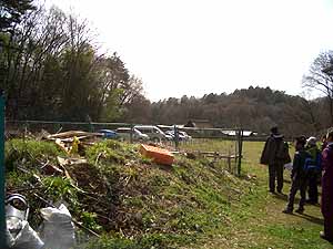 駐車場の隣接にゴミの山が残されていました。「里山民家《の整備が始まるまでのこの辺りは建設廃材や残土が捨てられていた場所で、ダンプカー9千台分のゴミを運び出して、水田や水路を復元したようです。今でも、撤去を拒んでいる地主がいるということでした。
