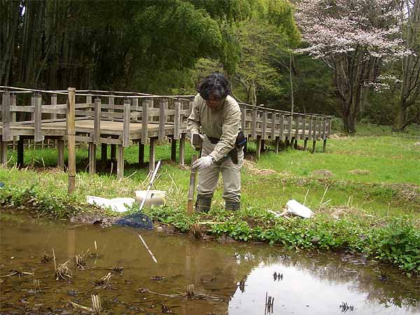 田起こしの前に、アズマヒキガエルのオタマジャクシを手網で掬って、一時的に避難させることにしました。