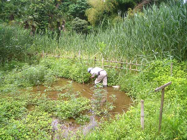下の田圃で、大きなアメリカザリガニがオタマジャクシを追いかけ回しているのを見つけて、これを捕獲しに田圃に入りました。