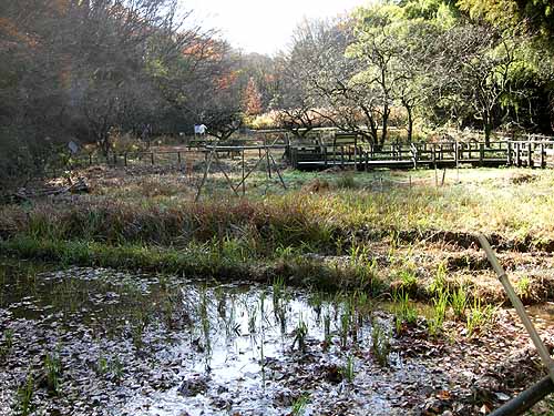 田圃に落葉が溜まってきて、水面が見えなくなりました。