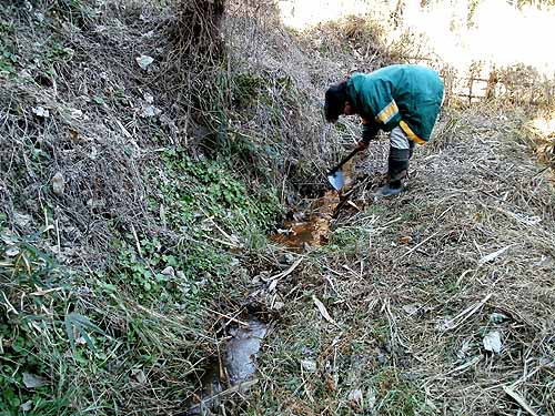 流れに溜まっていた落葉を取り除いて、水流を確保し、調査を行いました。