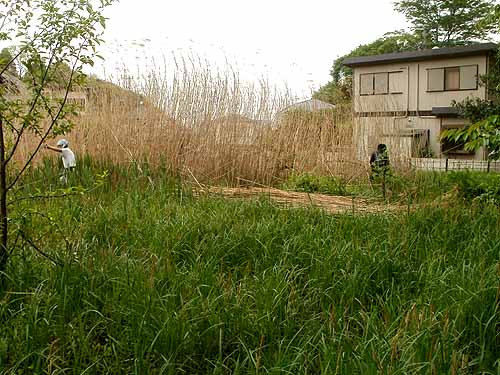 当初は、ヨシの上を覆ったフジ、クズ、カナムグラ、カラスウリなどが汚らしく絡み合っていましたが、ヨシだけだと枯れても、景観要素として魅力的な存在になっています。