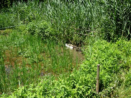 下の田圃の堰の下から水が洩れていて、水位が下がっていました。