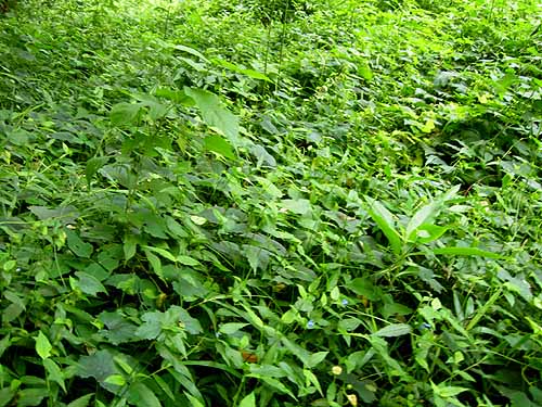 ザッと調べたところでは40種ほどの植物が見られ、一番上にはカラスウリやノササゲ、ヤブマメ、カナムグラ、ヤマノイモなどの蔓性植物が全体を