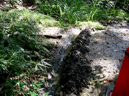 確かに、排水溝いっぱいに土砂が溜まっていて、園路の舗石の表面を湧水が濡らしていました。