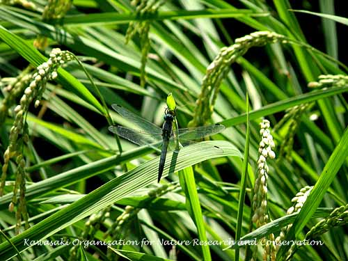 田圃にはシオカラトンボとオオシオカラトンボが10匹ほど縄張りをつくっています。