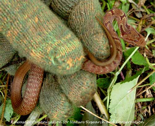 オダを組み立てようとした時、下口さんが草地の中でシマヘビの幼蛇を見つけました。