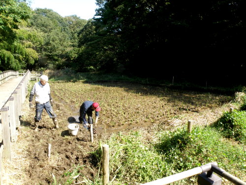 田圃の周囲で刈り残していた部分も畦の上、田圃内については、残っていたミヤマシラスゲやオオミゾソバも刈り取り、根を切り、スコップとジョレンを使って、少しずつ、泥を畦にあげていきました。