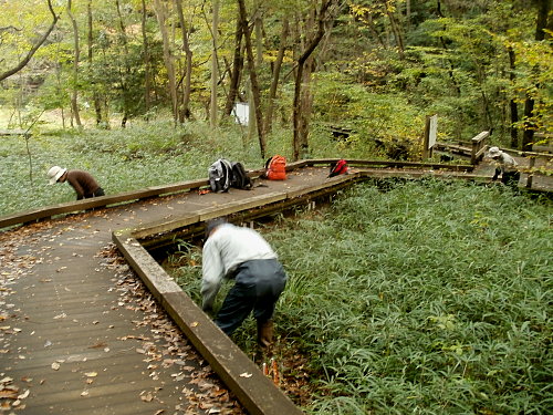 この日は西側の木道に面した水流の前回手をいれた部分の下流と東側の水流(ミヤマシラスゲの群落より下流)の手入れ、林床の落枝の片付け、アズマネザサ刈り、低木の間伐などを行いました。
