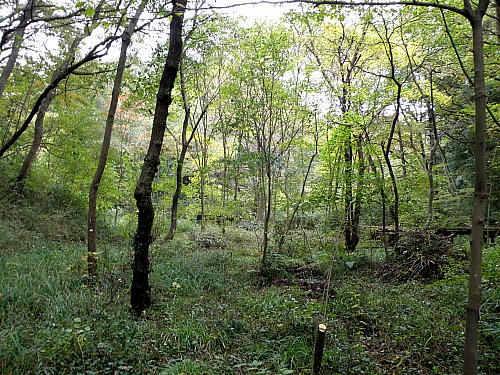 次に、林床の落枝を片付け、アズマネザサを刈り、イヌツゲ、マユミ、ノイバラ、アオキなどの蘖(ひこばえ)や実生を除伐し、