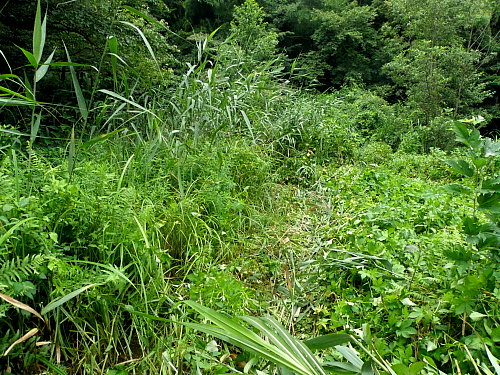 湿地の水辺保全 日時 2013/7/24(水) 10:00〜13:00 曇 場所 生田緑地湿地 参加者 岩田臣生 22日の水環境調査の時に、湿地の池の水が完全に涸れていました。 これは湧水の流量が少なくなっていることだけの問題ではなくて、水路のどこかで水漏れを起こしているものと思われました。 そこで、これを補修しておくことにしました。 私たちが湿地と言っている場所は、昔は田圃だった所です。 そこに土砂崩れによる土砂が流れ込んだため、元の地主さんは、田圃を続けることができないと判断し、排水を良くして畑に転換しようとしたそうです。 でも、何処からともなく水がしみ出してきて、良い畑にはならなかったそうです。 私たちは、2004年11月から、ススキとヤマグワが繁茂していた場所に水路を掘り、水を引いて、湿地をつくり、 昔ここにあったという植物の復活を目標にした活動を始めました。 そして、目標とした植物の復活には成功したのですが、時々、水が抜けて、水域としては安定させることができていません。 その度に手をいれればいいと思っていますが、数年前から生田緑地の数本の湧水の流れが涸れることが起こるようになっていて、ここの水を安定させることが益々困難になりつつあります。 そんなことを繰り返していますので、水が涸れている原因は想像することができました。 現地に入ってみると、水漏れの原因は予想した通りで、水路に開いた穴から水が抜けていました。 今回は、その穴のある畔の部分を踏み潰し、水路の泥あげをすることで補修としました。 その後、流れ沿いに草刈りを進め、水が2段目に流れることを確認することができました。