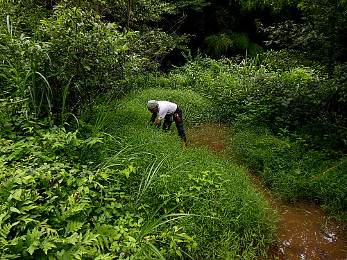 湿地の水辺保全(続き) 日時 2013/7/25(木) 10:00〜13:00 曇 場所 生田緑地湿地 参加者 岩田臣生 昨日(24日)の活動の続きとして水路内や岸辺のヨシなどを地中で刈り取り、泥上げをして、流れを遮る要素を取り除くことにしました。 この日は生田緑地で小学校の理科研究事業が行われていて、湿地とハンノキ林の境界の木道から同じ説明が何度も聞こえてきました。
