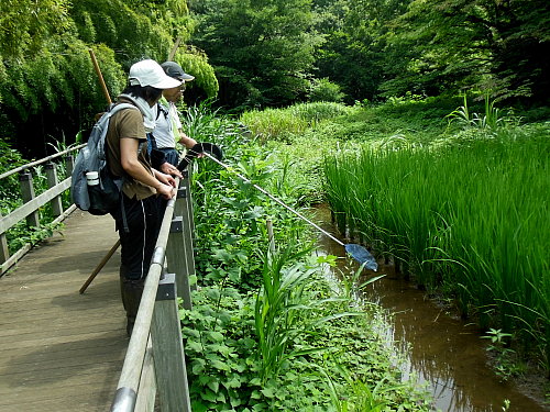 ヨシ原の池の管理、カナムグラ駆除 日時 2013/8/2(金) 10:00〜13:00 曇 場所 生田緑地ヨシ原 参加者 岩田臣生、岩田芳美、城本法子、鈴木潤三 ヨシ原はカサスゲやヨシが勢いよく繁茂していて、池がすっかり覆われてしまいました。 アメリカザリガニの駆除が必要と思われるものの、トラップが使えない程の状態になっていました。 そこで、池の中に侵出しているヨシやキショウブを取り除くことにしました。 とは言え、この暑さの中、ウエイダーを履く気にはなれません。 池の周囲のヨシなどの草を刈り、作業スペースを確保してから、長柄の鎌などを使って、根茎を切って、できるだけ根も一緒に取り除くことにしました。 ヨシの上にクズが広がっている所もありました。 キショウブが広がっている所もありました。 泥が溜まっていました。 それでも長靴では入れません。 作業しながら採集できたアメリカザリガニは30匹程でした。 田圃の稲は元気ですが、花穂はまだ出てきません。