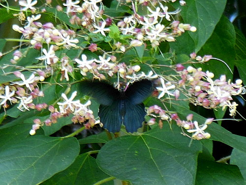 【C】 木道を挟んで上の田圃と反対側の草地のカナムグラ駆除も行いました。 ここは、ミヤマシラスゲ、ヨシ、ギシギシ、ノブドウなどが繁茂しています。 また、クサギが花盛りで、クロアゲハやナガサキアゲハが吸蜜に来ていました。