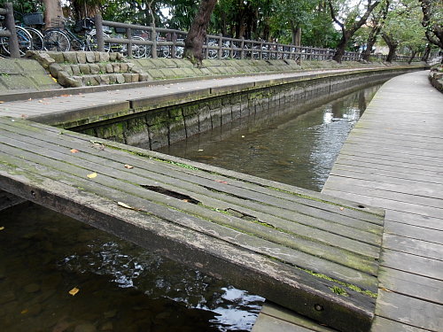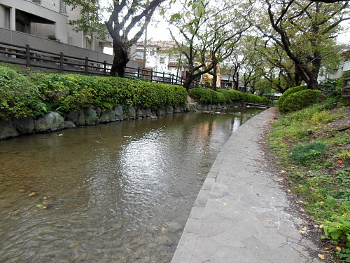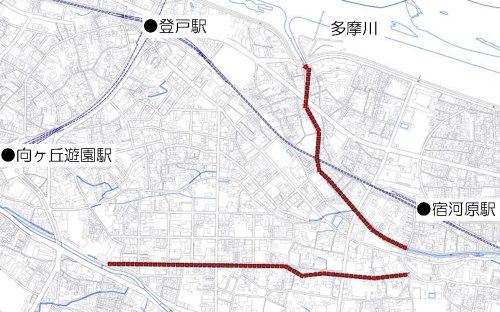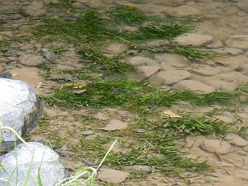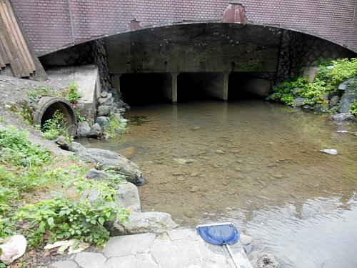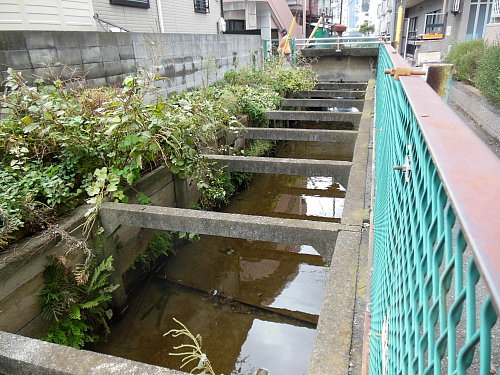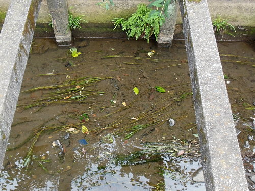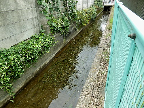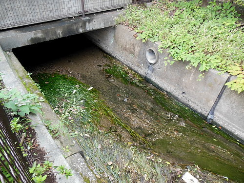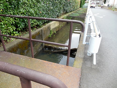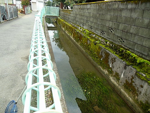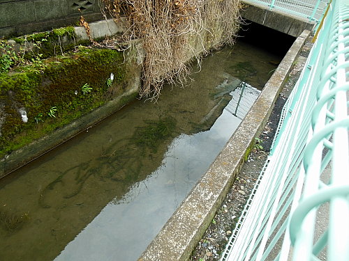 水辺調査 第9回 日時 2013/10/22(火) 10:30〜13:30 曇 場所 多摩川水系二ケ領用水(多摩区登戸〜宿河原) 参加者 岩田芳美 第9回水辺調査は水草があるか、ないかを調べることを主目的として、下図の2ヶ所の二ケ領用水を調べました。 台風25号通過後、数日が過ぎていましたが水量は多めです。 それでも2ヶ所の調査で要注意外来生物を含む藻類を確認しましたが、大きなコイが沢山いました。 特にコイの多い所では藻類は食べ尽くされて小石と砂利だけの川床となっていました。
