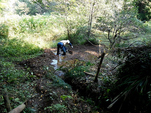湿地の保全活動 日時 2013/10/31(木) 11:20〜13:30 晴 場所 生田緑地稲目谷戸 参加者 岩田臣生、岩田芳美 生田緑地整備事務所での会議を終えてから谷戸へ降りて湿地の保全活動を行いました。 前回の続きです。 湿地の竹林側のヤマグワなどを刈り取り、水辺に溜まった泥をあげて、水面を開放する活動です。 チゴザサの根が張っている所は一筋縄ではいきません。 この日は、その手前までで止めました。