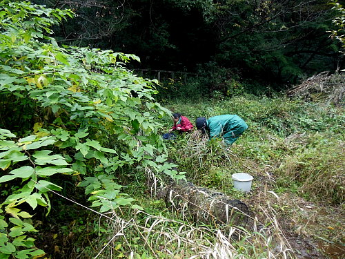 アメリカザリガニ駆除 日時 2013/11/7(木) 13:00〜15:30 曇(昼まで雨) 場所 生田緑地 湿地〜上の田圃 参加者 岩田芳美、木坂陽子、細川洋子 湿地の3段目の池に小さなアメリカザリガニが多数いることが分かっていたので、駆除活動を行いました。 今月から水辺保全活動に参加してくれるメンバーが増えましたが、女性なので、アメリカザリガニの駆除ができるのか不安でした。 しかし、嬉しいことに、こんなことを楽しんでくれる人たちでした。