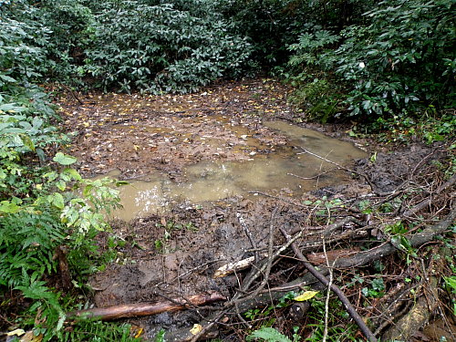 水辺保全 日時 2013/11/7(木) 13:00〜15:30 曇(昼まで雨) 場所 生田緑地ハンノキ林〜田圃 参加者 岩田臣生 天気予報通り、昼には雨があがって、活動することにしました。 ハンノキ林の中を流れる水流のうち最も西側の流れの上流部の池の泥上げを行いました。 今回は堰の近くのみとしましたが、5〜6回かけて、ため池的な機能を担える池にしたいと考えています。