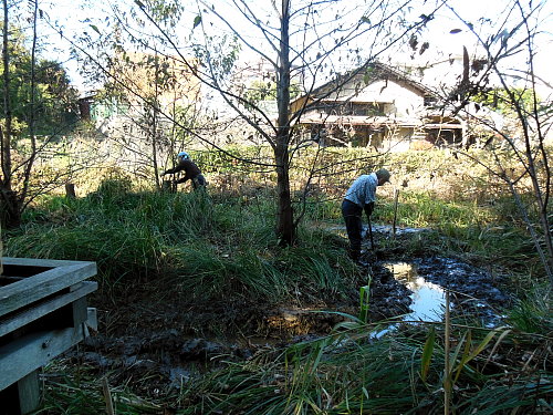 ヨシ原の水辺の泥上げ、アメリカザリガニ駆除、一部の草刈り 日時 2013/12/5(木) 10:00〜12:30 晴 場所 生田緑地ヨシ原 参加者 岩田臣生、岩田芳美、鈴木潤三 秋の水辺保全活動は、ハンノキ林、湿地、上の田圃、下の田圃と下流に向かって進めて、ヨシ原まできました。 ハンノキ林内や湿地は一度にやらずに何度かに分けて行います。 ヨシ原が済んだら、また少し手をいれます。 水辺保全と言っても、基本的には泥あげに過ぎません。 谷戸の水流は細かい土の粒子を絶え間なく運んでいて、流れの緩い所には、泥が溜まります。 これを岸辺や畦にあげることで、岸辺や畦は少しずつ、しっかりと丈夫になります。 これを怠ると、岸も畦も柔らかくなって崩れ易くなってしまいます。 ヨシ原の池はすっかり泥に埋まって水深1〜2cmの沼になっていました。 そんな所にもアメリカザリガニ数百匹が集まっていて、3〜5cm大のものを200匹程駆除しました。 驚いたのは、その中に、ホトケドジョウが1匹見つかった事です。 よく、食べられずにいたものです。 ここも下の田圃と同じように深いので長靴で中に入ることはできません。 岸辺から作業したいと思いましたので、池の中のヨシなどは長柄の鎌で根茎を切り取り、潰れた岸辺はスコップで切り落とし、ジョレンで泥を上げていきました。 中央の水流から水を引き入れるための水路の泥上げも行いました。 こちらはカサスゲが繁茂してしまい、水路の形を失っていました。 水路内のカサスゲの根を取り除きながらの泥上げとなりました。 それから、夏の間繁茂していたカナムグラやクズなどの刈り取り、片付けにも手をつけました。