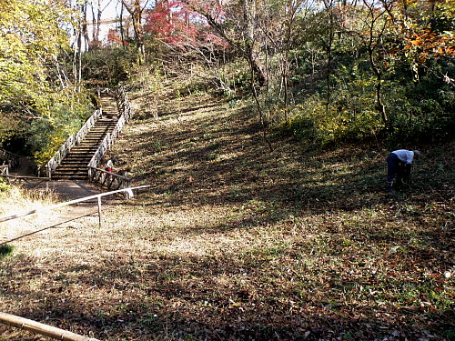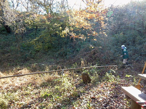 ピクニック広場東斜面の草刈り 日時 2013/12/12() 10:00〜13:30 晴 場所 生田緑地ピクニック広場 参加者 岩田臣生、岩田芳美、鈴木潤三、細川洋子 ピクニック広場の草地の草刈りを行いました。 2012年3月にミズキなどの樹木を伐採した東側の斜面下部の萌芽の勢いは衰えて、ヤマグワ、クサギ、ニワトコなどの実生が、2度目の夏は、繁茂していました。 草地の方はツリフネソウが優占していました。 このためかどうかは分かりませんが、ナギナタコウジュは非常に少なくなりました。 夏期の草刈りも試したいと思いますが、今回はアズマネザサ、ヤマグワなどの実生木を除伐して樹林にしないための管理を行うこと、 そして春のスミレなどの草本のために枯れた草や落葉を減らしておくことを目的とした草刈りを行いました。