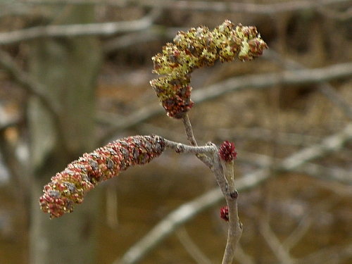 G 湿地3段目の池 竹林側からの水が止まっていました。 途中で伏流していましたので、応急的に孔を塞ぎました。 ハンノキ林の雄花が花粉を撒き散らし、雌花が受粉態勢にあります。