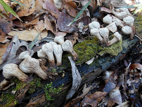 放置してあった腐朽木から沢山のキノコが生えていました。すっかり古くなっていましたが、タヌキノチャブクロかも知れません。