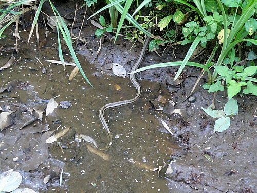 水の広がり始めた田圃にシマヘビが死んでいました。 尾部が無くなっています。 頭部も体も綺麗なので、戦いに敗れて死んだとは考え難い状態でした。 ただ、その尾部は畔に開いた孔の中にありました。