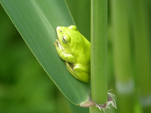 産卵を終えたシュレーゲルアオガエルがヨシの葉上で休んでいました。