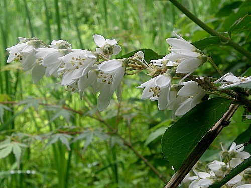 田圃の苗は無事であることが分かりましたので、湿地の保護植物の状態を調べることにしました。 数としては満足できる数の発芽が見られましたが、オオミゾソバが覆いかけていましたので、ヨシ、オオミゾソバ、コガマなどを駆除しました。 チゴザサの駆除も始めなければならないと思いますが、次回以降にすることにしました。 ウツギの花が咲いていました。