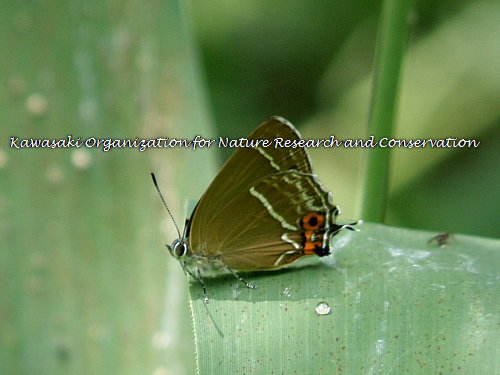 また、ヨシの葉裏にはクロコノマチョウ幼虫が鮮やかな黄緑色の姿を見せました。 更に、ハンノキの近くのヨシの葉上にはミドリシジミ♂が止まっていました。 このミドリシジミは暫くすると翅を開き、間もなく飛び立って行きました。