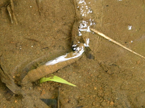 11:20〜11:50 A 下の田圃裏の水流 水流にはホトケドジョウのほか、大きなガガンボの幼虫に食いついている小さなヤマトクロスジヘビトンボの幼虫がいました。 体に勝るガガンボの幼虫はヤマトクロスジヘビトンボの幼虫を振り回すのですが、ヤマトクロスジヘビトンボの幼虫は大アゴを放しません。 薄暗い流れの水底での生存をかけた戦いは続いていましたが、見続けたい気持ちを断ち切って、調査を継続しました。