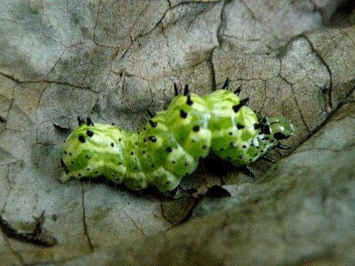 丸まった大きな枯葉の中を覗いて見たら、クモやウスグモスズと一緒にウリキンウワバ(ヤガ科の蛾)の幼虫がいました。