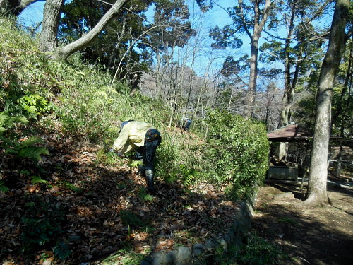 中央広場北雑木林のアズマネザサ刈り 日時 2015/2/10(火) 10:00〜13:00 晴 場所 生田緑地 中央広場北雑木林(東側斜面) 参加者 岩田臣生、岩田芳美、鈴木潤一、細川洋子 中央広場北雑木林については2/7(土)にアズマネザサ刈りを行いましたが、やり残した東側斜面のアズマネザサ刈りを、今回、行いました。 低木層にヤマツツジ、草本層には、コウヤボウキ、ウグイスカグラ、タマノカンアオイ、○○などが見られます。 よく管理された明るい雑木林と言えそうです。 作業している傍にはモズが飛んできて枝に止まり、獲物を見つけると地面に降りて、何やら啄んでいました。 刈ったアズマネザサや落葉、落枝などは斜面下端部のやや平坦な場所に積みました。 また、7日に置いておいた竹やアズマネザサも、ここに移動しました。