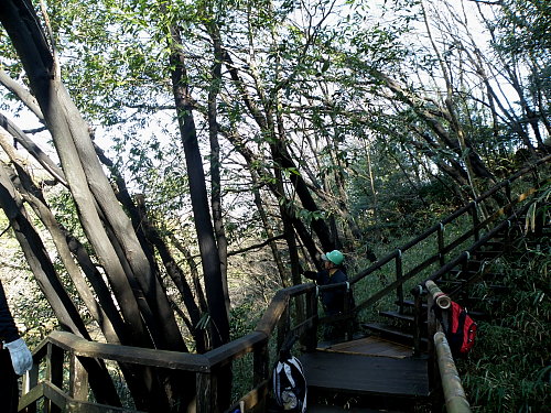 常緑樹小径木の伐採とアズマネザサ刈り 日時 2015/2/19(木) 10:00〜13:00 快晴 場所 生田緑地 梅畑・芝生広場・ハンノキ林分岐付近の木道沿い 参加者 岩田臣生、岩田芳美、鈴木潤三、富内雅美、細川洋子 谷戸へ降りて、ピクニック広場でシロハラ、萌芽更新地区下でアオジ、ハンノキ林でコジュケイの親子、コゲラに出会いました。 コジュケイは初めてという人もいましたので、アズマネザサの茂みにいた親子に釘付けになりました。 さて、樹下の暗さについては普段意識することはないと思います。 しかし、ホタルの国を歩いていると、同じ樹下でも一際暗い場所があることに気がつきます。 その暗い場所というのは常緑樹に覆われた場所だということが、日中歩くと分かります。 生田緑地の雑木林の林床には普通、アズマネザサが繁茂していますが、こうした暗い場所ではアズマネザサは疎らであったり、更に暗い場所では草本層に何もない裸地となっています。 今回植生管理を行う場所は、三叉路で、階段があって、一際暗いために、ホタルの国でも渋滞や小さな事故が発生していた場所です。 この場所の常緑樹を数本伐採し、少し明るくしようと考えました。 勿論、これはアズマネザサを元気に繁茂させるためではありません。 ここで消えそうになっていた里山の植物の生育環境を保全するためでもあり、合わせて木道沿いのアズマネザサを刈りました。 今までは、ホタルの国の準備として木道に蓄光目印を貼る時に、合わせて木道沿いのアズマネザサも刈っていました。 今回は裾刈りと言える程度に広げて刈り取り、将来的には、木道を歩きながら野草を楽しめるようにしたいと考えました。 アズマネザサ刈りをしている頭上2mほどの枝に、エナガが数羽飛んできました。 また、竹林の方でルリビタキの声がしました。 通行する来園者も多かったのですが、野鳥班の平賀さんや森さんも通り、トラツグミに出会ったことを聞きました。 木道の直ぐ傍、エゴノキの近くにあった直径12〜15cm程のシラカシを1本除伐しました。