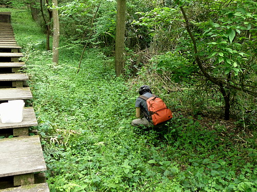 中大型哺乳類調査定点カメラ設置 日時 2015/4/30(木) 10:00〜12:10 晴 場所 生田緑地 中央地区南側 参加者 岩田臣生、Paul Massie モニ1000里地調査中大型哺乳類調査の5〜6月期調査の定点カメラは4/28に2台設置しました。 この日は、残りの1台を持って、中央地区南側のフィールドサインを調べて歩きました。 今までに調べていなかった場所も丁寧に調べて歩きましたが、なかなかカメラを設置したくなるような場所がありません。 今までに調査地点に使っていた場所でも、明らかに通過個体数が減っていると思われました。 中央地区南側の定点カメラ調査は止めようかと諦めかけて、密生するアズマネザサの茂みをやっと抜け、園路まで僅かというところに明確な獣道を見つけました。 ここは頻繁に使われていそうです。 辺りの景色から過去に定点カメラを設置した場所であることを思い出しました。 データを見直してみると2009年5月期の調査でした。 その時の調査結果は、25日間の調査で、僅かに、ハクビシン8、ネコ4、タヌキ1というものでしたので、その後は調査していませんでした。 写真を見ると、獣道の位置やルートも変わっていました。