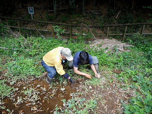 哺乳類調査をしていた2人が電話で呼ばれて、作業内容の確認と若干の修正を行い、この日の水辺の保全活動を終了しました。
