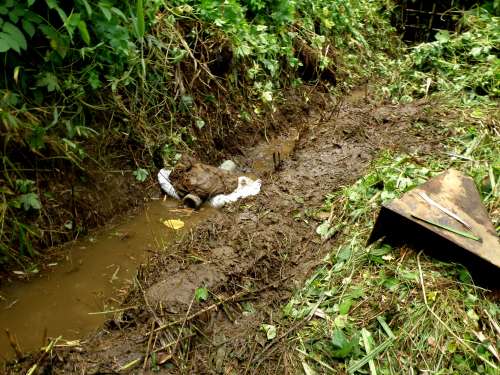 田圃裏の水流まで辿り着いたところで、まず、埋まっていたパイプの口を見つけ出して、ヨシをパイプに通して掃除を行って、田圃への水を確保しました。