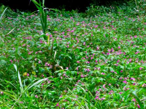 水域にはアメリカザリガニが逃げようともしないでのんびりしていました。 ジョレンで掬って、7cm大3匹を駆除しました。 田圃周辺のツリフネソウが見ごろを迎えつつあります。
