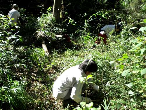 ハンノキ林保全(アズマネザサ刈り、水路の泥あげなど) 日時 2015/10/8(木) 10:00〜12:30 晴 場所 生田緑地 ハンノキ林 参加者 岩田臣生、岩田芳美、鈴木潤三、田村成美、細川洋子 生田緑地のハンノキ林は環境省の特定植物群落に指定されている自然林です。 生田緑地の生物多様性を考える上で最も重要な場所の一つです。 夏至の頃には「ホタルの国」の森のステージとなり、ゲンジボタルの幽玄な光の舞を楽しませてくれます。 林床の水流には、かつての多摩丘陵には普通に見られていた水辺の生物が生き残っています。 しかし、ハンノキ林は自然の遷移の過程で一時的に出現する樹林であり、やがて消えていくのが自然です。 実際、活動を始めた頃は、高さ3〜4m、太さ1cmを超えるアズマネザサが密生し、無数のアオキが繁茂していました。 ハンノキ以外の樹木もかなり入っています。 昔のハンノキ林を知る人の話では、林床の湿地には今では珍しくなってしまった植物が見られ、オニスゲが繁茂していたそうです。 現在、林床にオニスゲは見られません。それだけ林床が暗くなっていることを物語っています。 しかし、長い時間をかけて、少しずつ暗くなった場所であり、その環境に適応する生物が生息しているはずですから、単純に明るくすればよいという話ではありません。 林床に生き残った生物を保護するために、その生息環境を保全する必要があると考えていますが、生田緑地のホットスポットに手を入れることに伴う大きな責任を受け止める決心がつかず、簡単には手が出せませんでした。 そこに林床の陸地化が進んでいるという指摘を様々な人から度々聞かされることで、取り返しのつく範囲でやってみようと決心し、2006年12月に、植物班の協力を得て、ハンノキ林内の樹木調査を7日間かけて行いました。 この調査の結果、ハンノキ林と称している区域の南の方にはハンノキが少なく、ヤマグワやアカメガシワが集中していることが分かり、この辺りから手をつけることにしました。 私たちの活動の目的はハンノキ林の更新ではなく、ハンノキ林に生き残った生物の生息環境を保全することです。 「取り返しのつく範囲で、やってみて、考える」という原則に立って、少しずつ進めてきた経過にについては、ここでは省きます。 今日の活動の目的の一つは、ハンノキ林南端部のアズマネザサ刈りです。 昨年アズマネザサ刈りをしていませんでしたので、勢いよく伸びていました。 これらのアズマネザサを刈り、今年1月に伐採したアカメガシワの萌芽枝も除伐しました。