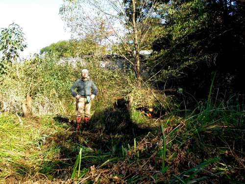 ヨシ原のハンノキ伐採 日時 2015/11/28(土) 10:00〜13:20 晴 場所 生田緑地 ヨシ原 参加者 岩田臣生 ヨシ原のハンノキ 3本のうちの 1本を伐採しました。 ここのハンノキは生田緑地に自生していたハンノキではありません。 ホタルの里整備事業によって、この場所に階段と木道が設置されました。 この辺りを散策する人たちの中には、双眼鏡を使って、辺りを眺めている人も大勢います。 そのため、この木道の直ぐ近くに住んでいたTさんから、「家の中を覗かれているようだ。目隠しが欲しい。」という声が出されました。 一方、隣地で畑を耕作していたYさんからは、「樹木など植えられては困る。止めてくれ。」という主張があり、対立していました。 北部公園事務所としては、木道整備による実害を評価して、目隠しのためにカツラの苗木を植えました。 しかし、これは直ぐに枯れてしまい、その後に、替わりにハンノキを植えました。 やがて、諸事情からTさんが引っ越し、目隠しを求める人がいなくなりました。 これを待っていたかのように、2008年夏には、Yさんから、ハンノキを伐ってくれと北部公園事務所に要望が出されました。 2007年1月からヨシ原のヨシの管理などを水田ビオトープ班が始めていましたので、このハンノキの伐採について、北部公園事務所から現地立会を求められ、造園業者を入れた3者で現地協議を行い、 いくつかの注意事項を付して伐採することを決めました。 確かに、これらのハンノキは大きく成長していました。 しかし、持ち込みの樹木とは言え、絶滅危惧種のミドリシジミが生息するようになって、谷戸の末端部でもミドリシジミに出会えるようになっていました。 このハンノキを除伐してしまえば、この辺りでミドリシジミに出会うことはできなくなるでしょう。 2009年6月頃、Yさんに会った時に「北部公園事務所は伐採すると約束したのに、まだ伐採してくれない。」という話が出てきましたので、「私が年内に伐採する」と約束しました。 伐採するとは言っても、除伐ではなく、萌芽更新を繰り返して、大きくしなければいいだろうと考えていました。 そして、5本ぐらいなら簡単に伐採できると思い、2009年11月27日に、一人で伐採することにしました。 (活動参照) しかし、始めてはみたものの、隣地側の2本は住宅側に傾いていたため、垣根を壊したら大事になると思い、木道側の3本のみ伐採し、残りの2本は北部公園事務所に任せることにしました。 この活動によって、伐採作業しながらミドリシジミの卵を見つけるのは困難だと分かりました。 そして、伐った枝を積んでおいて、後から、関心のある昆虫班のメンバーに卵を見つけて保護してもらいました。 翌年(2010)、3本は萌芽更新が成功しましたが、2本は枯れてしまいました。 2013年になって、また、Yさんが伐採しろと言い出しました。 この時は、生田緑地には指定管理者が入っていましたので、指定管理者から相談されて、年に1本ずつの伐採で勘弁してもらうことにしました。 2014年11月28日に、1本伐採し、伐採した枝などは、別のハンノキの根元に積みました。 (活動参照) その枝についていた卵が孵化した時に、生命力のあるミドリシジミなら自力で、そのハンノキに上って生き延びてくれるだろうと考えてのことです。 また、1本なら比較的容易く伐採処理ができるだろうと考えました。 伐採した枝にあった卵がどうなったかは不明ですが、伐採したハンノキからは萌芽枝が伸びています。 今年もまた、「まだ伐採しないのか」と催促を受けたと指定管理者から話を聞きました。 この日のハンノキの伐採は、こうした状況による伐採です。 通りがかりの来園者が「何でハンノキを伐採するのか」とクレームをつけてくれることを期待していましたが、残念なことに苦情を言ってくれる人はいませんでした。 ミドリシジミの発生時期でもなければ、そんな人はいるはずがないのですが、...。 絶滅危惧種の保護よりも、隣地からの「畑に不都合だから伐れ」というクレームを優先させるという生田緑地整備事務所の方針に納得しているわけではありません。 このクレームは、ハンノキを植えた時の経緯に対する感情的なものが原因だと思われ、実際に作物に影響があるのかは疑問視しています。 川崎市の生物多様性地域戦略は、こうした地域の個別の課題に対しては、解決の糸口を与えてはくれないようです。