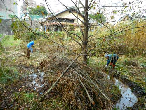 ヨシ原〜下の田圃付近のヨシ、カサスゲなどの刈り取り 日時 2015/12/10(木) 10:00〜12:30 曇 場所 生田緑地 不動谷戸(最近見つけた古い資料による地名) 参加者 岩田臣生、岩田芳美、鈴木潤三、田村潤三、細川洋子、政野祐一 指定管理者が生田緑地の清掃活動として回収した落葉を、田圃の肥料として頂戴することにしました。 この落葉は袋に入れて、田圃近くに運んでおいてくれましたので、これを上の田圃に撒きました。