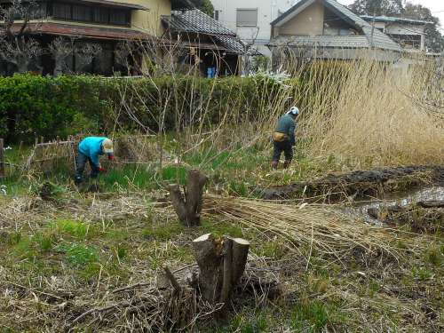 ヨシ原 岩田、田村、山下は、キショウブの駆除をすることにしました。 今年は、谷戸の谷底はどこも湿地状態です。キショウブにとっては好環境のようです。 キショウブが生えている垣根沿いの枯れヨシを鎌で刈って、キショウブは三本爪の鍬で掘り起こすことにしました。 しかし、太い根茎がしっかり張っていて、足元の土はねっとりと纏わりついて、なかなか捗りません。