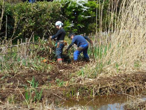 ヨシ原のキショウブ駆除、キヅタ剥ぎなど 日時 2016/3/31(木) 10:00〜12:30 晴 場所 生田緑地 ヨシ原 参加者 岩田臣生、鈴木潤三、田村成美、 生田緑地の桜も咲き、気温も上がって、来園者が大勢歩いていました。 生田緑地整備事務所付近のコナラにアオゲラが来ていました。 谷戸に降りると自然観察が始まりました。 新芽が伸び出したベニシダとミドリベニシダが並んでいて、見比べることができます。