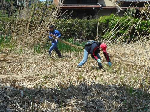 ヨシ原のヨシ刈り 日時 2016/4/12(火) 10:00〜13:00 晴 場所 生田緑地 ヨシ原 参加者 岩田臣生、岩田芳美、木坂陽子、田村成美 谷戸は、ヤマザクラが咲く頃は一際美しくもあり、長閑でもあります。 ウグイスの声とシュレーゲルアオガエルの声が谷戸に響きます。 その頃が田起こしの季節だと思っていますが、冬季湛水の田圃では、田起こしとは言えないと思います。 ただ、田植え直前の代掻きが容易にできるように、湛水された状態で耕すということを行っています。 しかし、アズマヒキガエルのオタマジャクシが広がっていますから、そのオタマジャクシを避難させるのが一大事です。 目の前の大量のオタマジャクシを見ていると、そんなことを考えてしまいます。