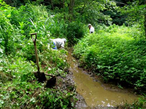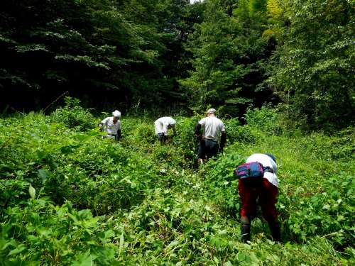 谷戸の水の管理、カナムグラ刈りなど 日時 2016/7/28(木) 10:00〜13:00 晴 場所 生田緑地 湿地、上の田圃 参加者 岩田臣生、岩田芳美、鈴木潤三、田村成美、細川洋子 夏の生田緑地の谷戸の保全活動は、@湿地再生地や田圃の水の管理とAカナムグラ刈りなどによる園路沿いのミゾソバやツリフネソウの保護管理です。 湿地再生の目的である植物は開花しましたが、水が3段目で涸れています。 今年は湿地の全域に水がある状態を維持したいと思っていましたが、できませんでした。 この日は、久しぶりに暑い日になりました。 今回は、一昨日、手を入れた水漏れ箇所の状態確認と更なる手入れ、場所不明の水漏れの調査などの水辺の管理、そして同じ湿地のカナムグラ刈りを行いました。 1段目から2段目に移る場所には水が溜まっていましたが、2段目には水が広がっていませんでした。 2段目に落ちた所でも水漏れを起こしていると思われます。 1段目側の水漏れ防止を強化し、2段目に落ちた水の漏れを止めることを試みました。 そして、2段目に水が流れ出したことは確認しましたが、時間をおいてみないと結果の判断はできません。 2段目の末端部の水漏れは、一昨日、補修したつもりでしたが、水は少し溜まったものの、樋から3段目に落ちるところまでには溜まっていませんでした。 改めて、水漏れ穴を探しましたが、大きな穴は見つけられず、手探りで、やっと、浸みだしているかも知れないと思われる土の柔らかい所を数カ所見つけて塞ぎました。 また、湿地のカナムグラ取りも行いました。 草むらには、オオシロガネグモ、サツマノミダマシなどのクモ類、トホシテントウやニジュウヤホシテントウなどのテントウムシ、オオシオカラトンボ♂♀、シオヤアブなどが、上空にはオニヤンマが飛んでいました。 木の枝や手摺りにはアカイラガの幼虫がいました。