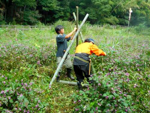まず、刈った稲をかける竹竿として適度な太さ、長さのものを選び、設置する場所に置きました。