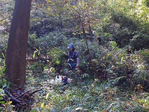 ハンノキ林のアズマネザサ刈り、水辺保全