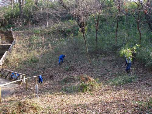 場所 生田緑地 ピクニック広場 参加者 岩田臣生、岩田芳美、鈴木潤三、田村成美 昨年末にできなかったピクニック広場の草刈りを行いました。 ピクニック広場東の階段上側は、観察会用に、タマノカンアオイやハンショウヅルなどの管理を行っています。 今回は、アズマネザサなどを刈り、落葉かきを行いました。 掻き落とした落葉は、背負い籠10数杯ありましたが、萌芽更新地区下の落葉溜めに運びました。
